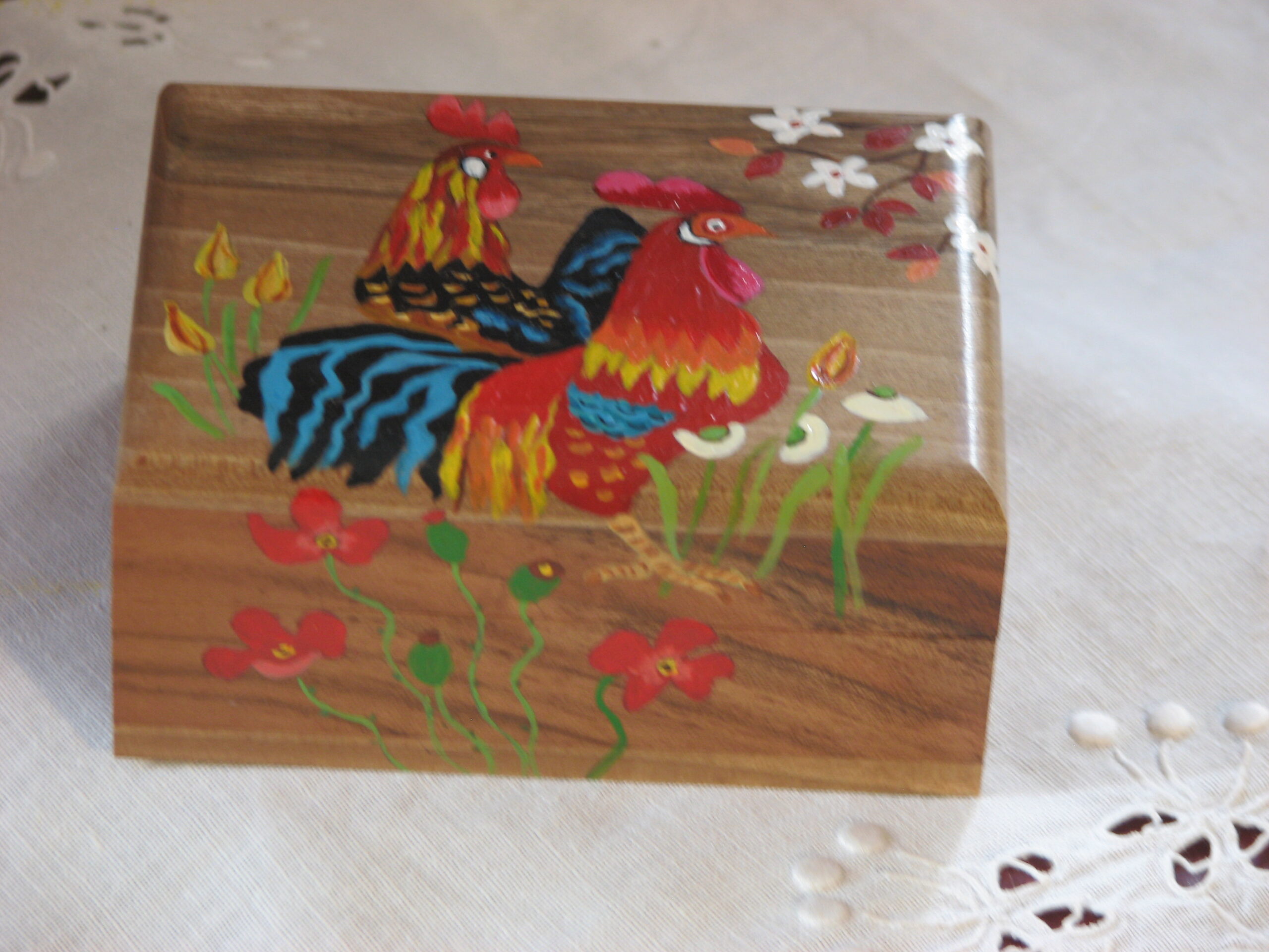 Ce coq aux plumes multicolores est inspiré de Dom Robert. Il est peint sur le bois brut qui est ainsi mis en valeur.