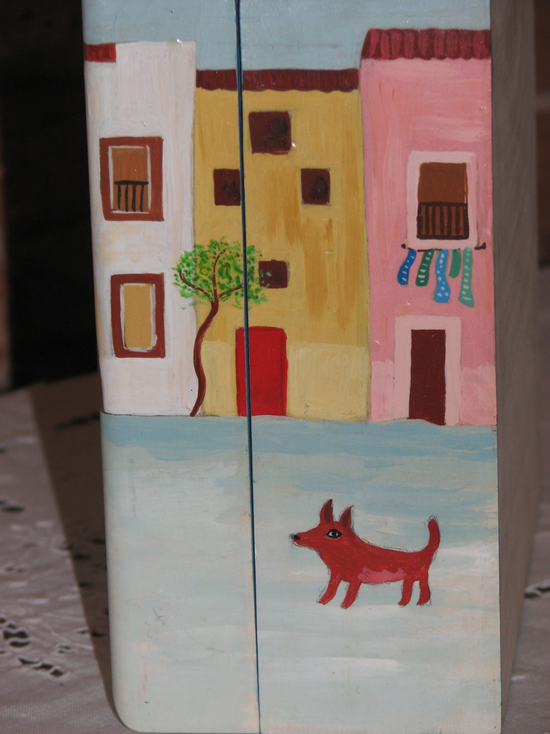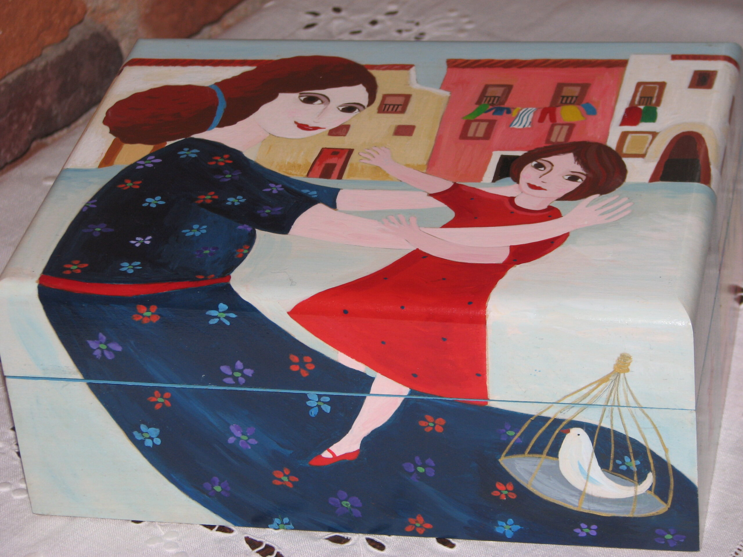 Cette maman portugaise chante des comptines à sa petite fille dans la cour de son village ou chacun vaque à ses occupations. Je me suis inspirée d’un livre de chansons et comptines portugaises et j’aime la complicité entre cette maman et sa fille. J’aime faire déborder la peinture sur l’avant de la boite et quand c’est possible, peindre aussi les cotés de la boite.
