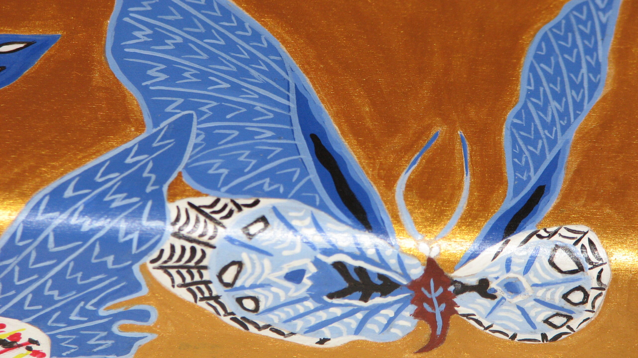 De grands papillons de nuit volent sur un fond doré et bleu nuit. L’approche de la nuit, c’est aussi le moment de la tisane dont on a rangé les sachets dans cette jolie boite!