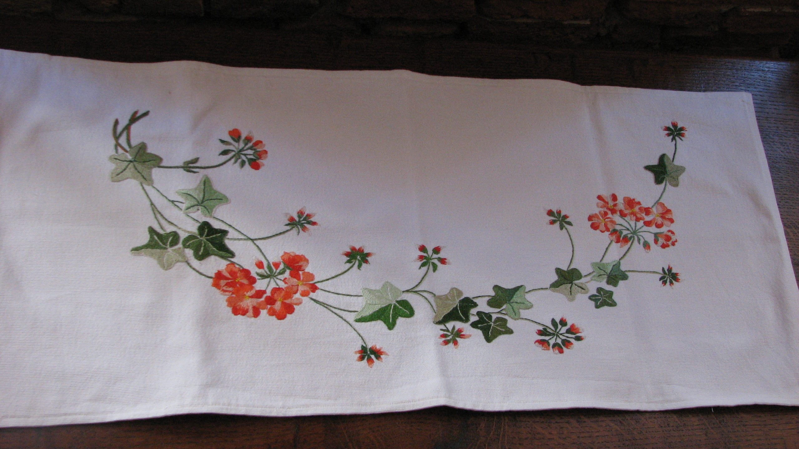 Ce motif de géranium a été entièrement brodé sur un beau tissu de coton blanc. C’est un motif très frais et printanier