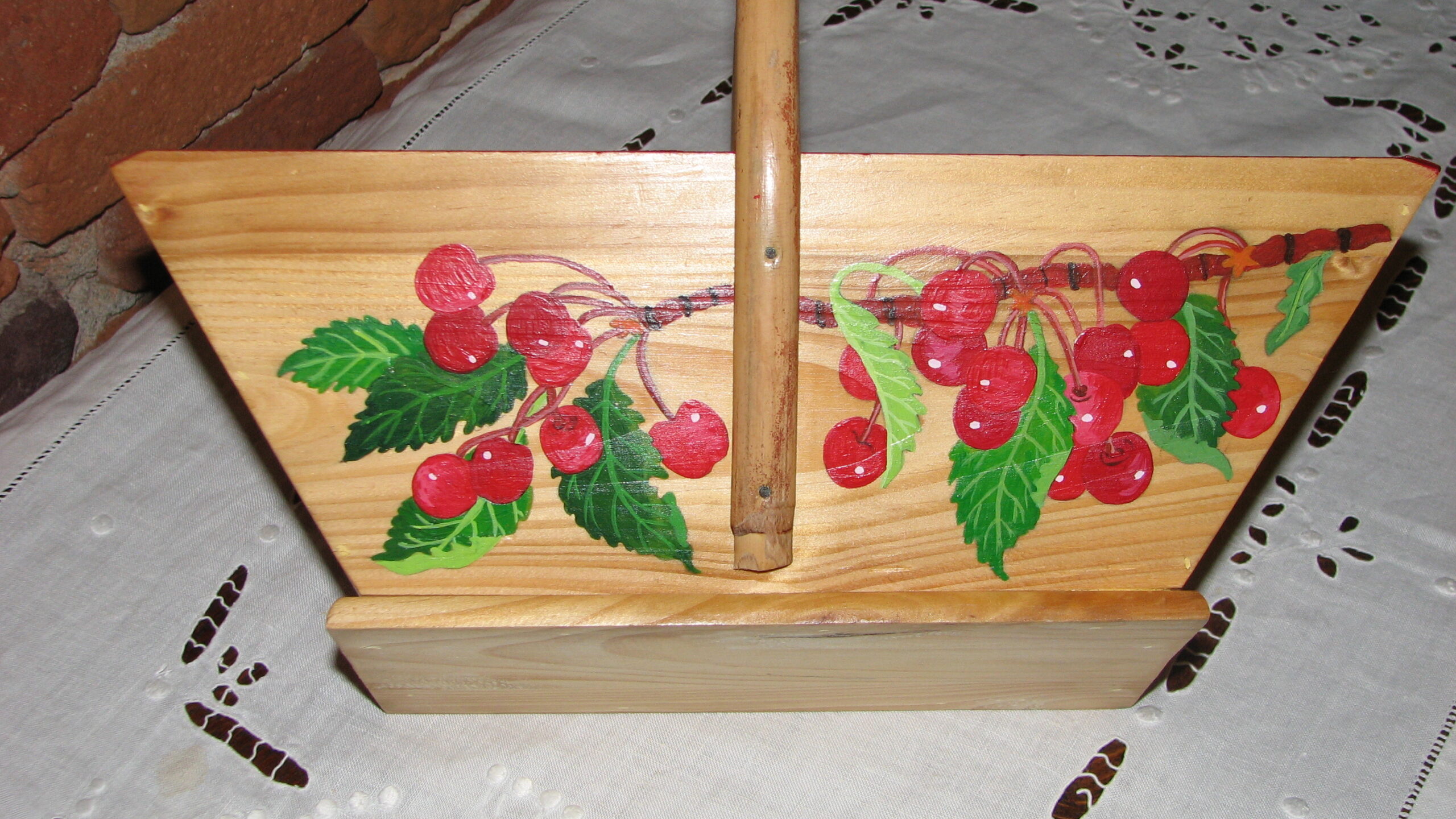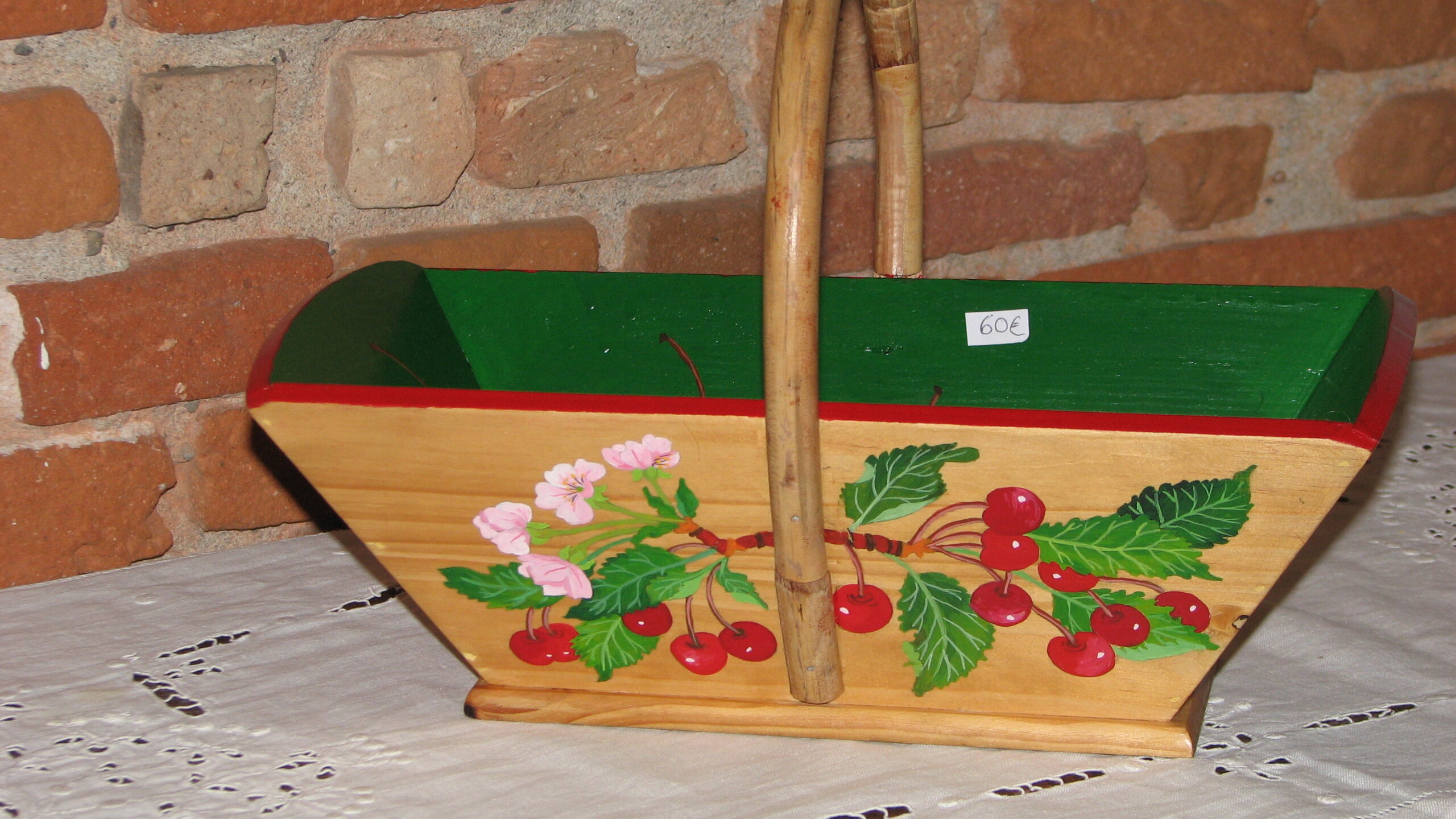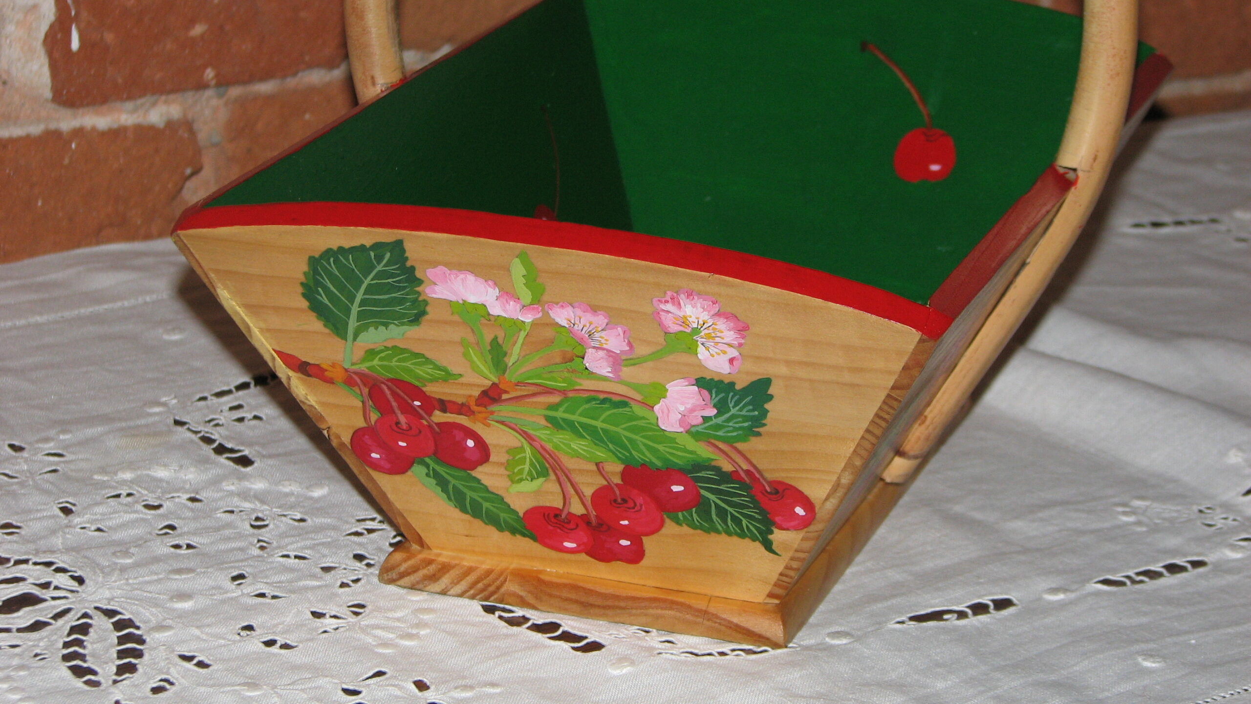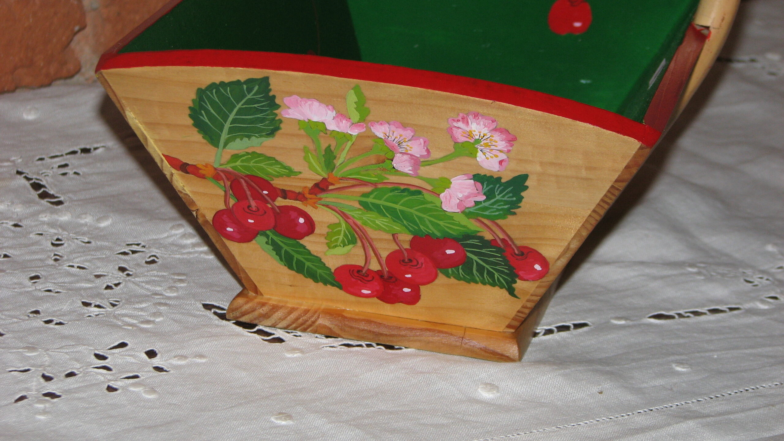 Ce panier en pin assez évasé est décoré de branches de cerisier avec fruits et fleurs. C’est un joli panier à fruits