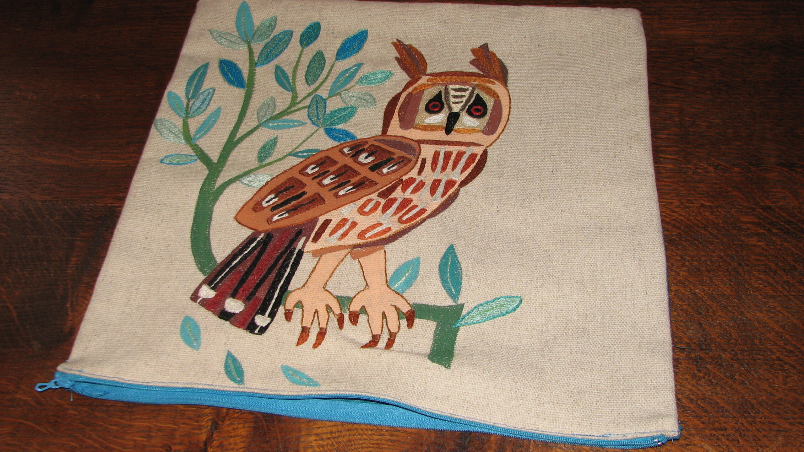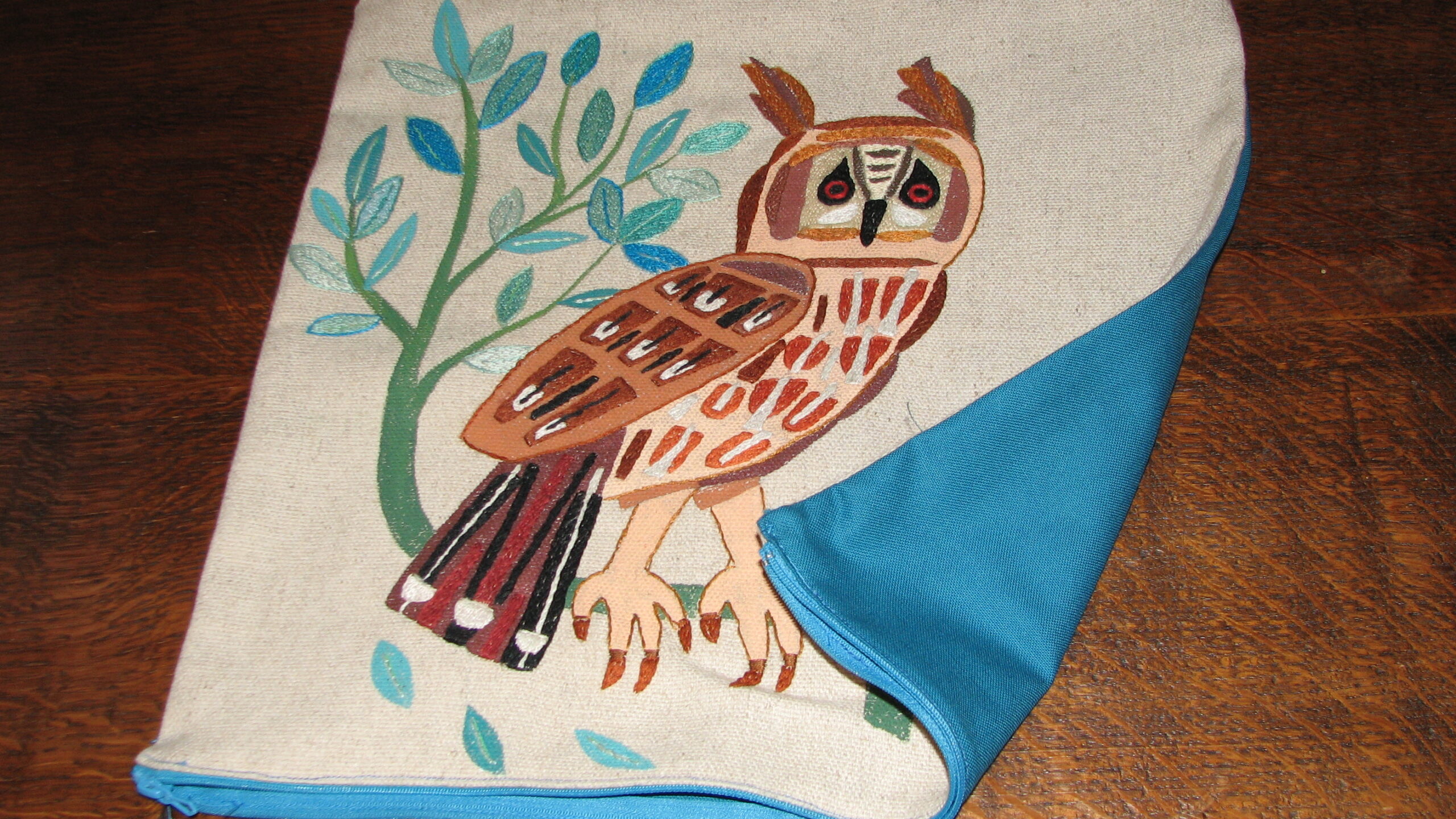 Ce hibou stylisé est peint et brodé dans des tons bruns et orangés et bleus et vert pour les branches et feuillages.