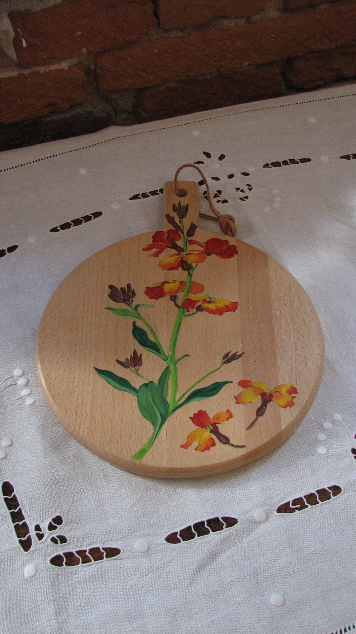 Petite planche en pin décorée d’une giroflée aux tons orangés qui peut prendre place dans une cuisine par exemple