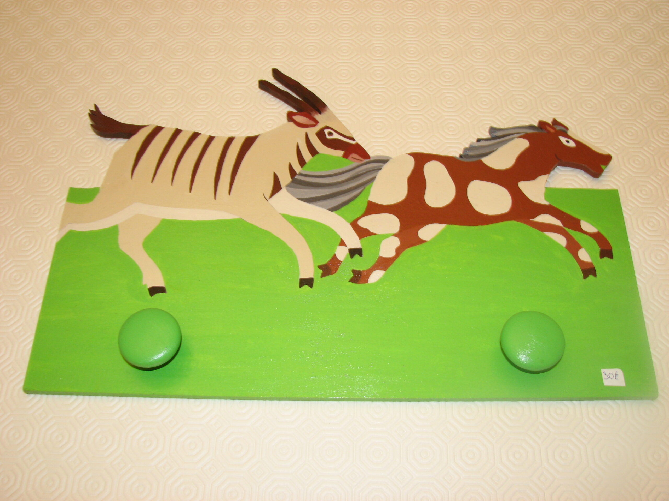 Deux gazelles se poursuivent dans l’herbe verte! Voici un porte-manteau original pour une chambre d’enfant qui lui permettra d’y accrocher son pyjama.